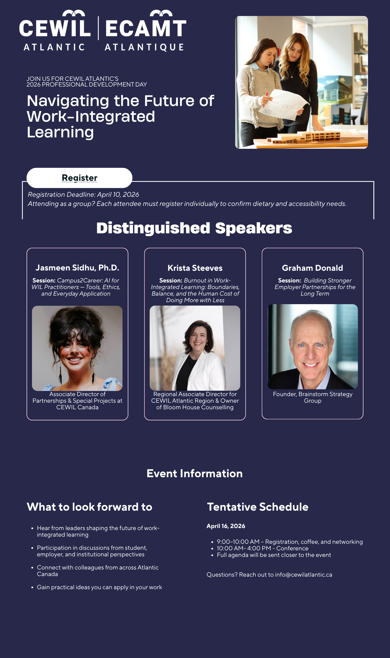 - February 26 Coffee Chat: Information and Communications Technology Council Report on the impact of Work Integrated Learning on Student Success with Faun Rice, Manager, Research & Knowledge Mobilization with ICTC Recording